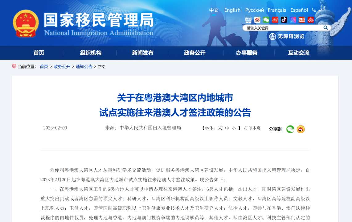 2月9日,中華人民共和國出入境管理局發(fā)布《關(guān)于在粵港澳大灣區(qū)內(nèi)地城市試點(diǎn)實(shí)施往來港澳人才簽注政策的公告》(以下簡稱《公告》)。