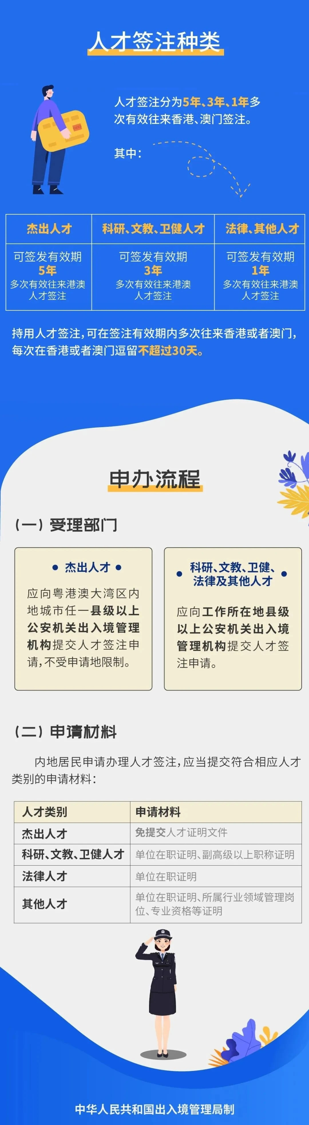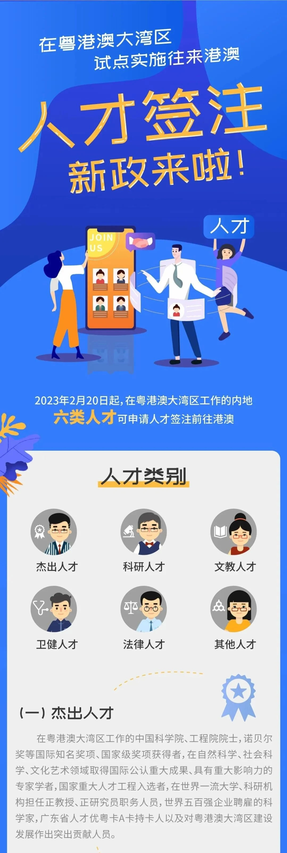 根據(jù)《公告》,2023年2月20日起,六類人才可申請?zhí)貏e簽注,特別簽注持有人可以在簽注有效期內(nèi)多次往來港澳地區(qū),每次在港澳停留不超過30天。
