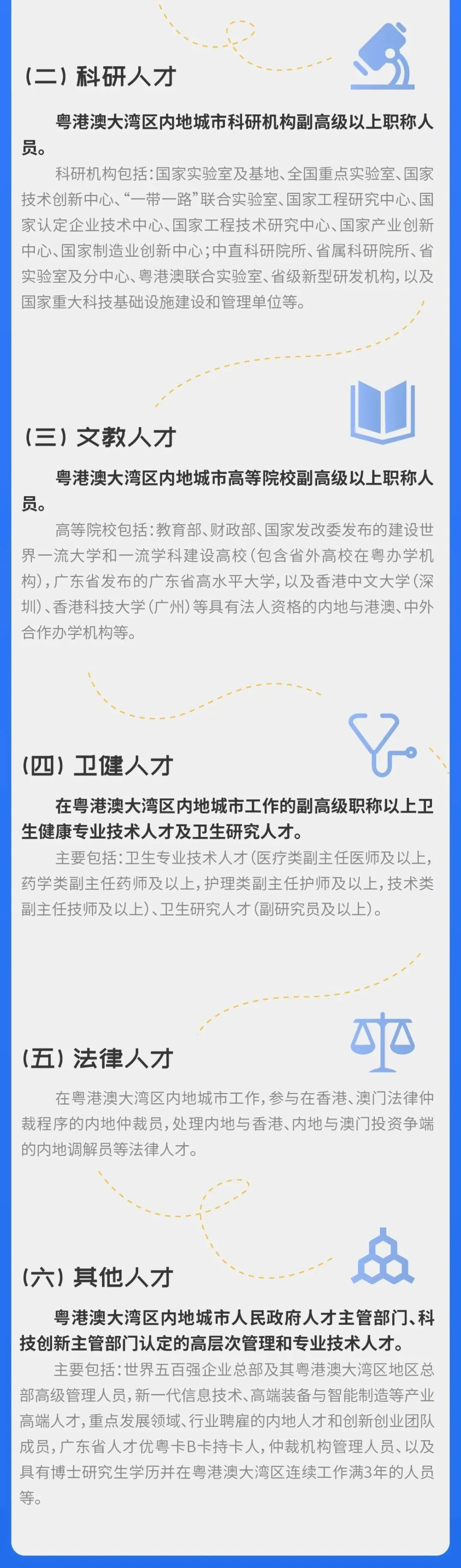 一、在粵港澳大灣區(qū)工作的6類內(nèi)地人才可以申請辦理往來港澳人才簽注,6類人才包括:杰出人才,即對灣區(qū)建設(shè)發(fā)展作出重大突出貢獻(xiàn)或者灣區(qū)急需的頂尖人才;科研人才,即灣區(qū)科研機(jī)構(gòu)副高級以上職稱人員;文教人才,即灣區(qū)高等院校副高級以上職稱人員;衛(wèi)健人才,即灣區(qū)副高級職稱以上衛(wèi)生健康專業(yè)技術(shù)人才及衛(wèi)生研究人才;法律人才,即參與在香港、澳門法律仲裁程序的內(nèi)地仲裁員,處理內(nèi)地與香港、內(nèi)地與澳門投資爭端的內(nèi)地調(diào)解員等;其他人才,即由灣區(qū)人才、科技主管部門認(rèn)定的高層次管理和專業(yè)技術(shù)人員。