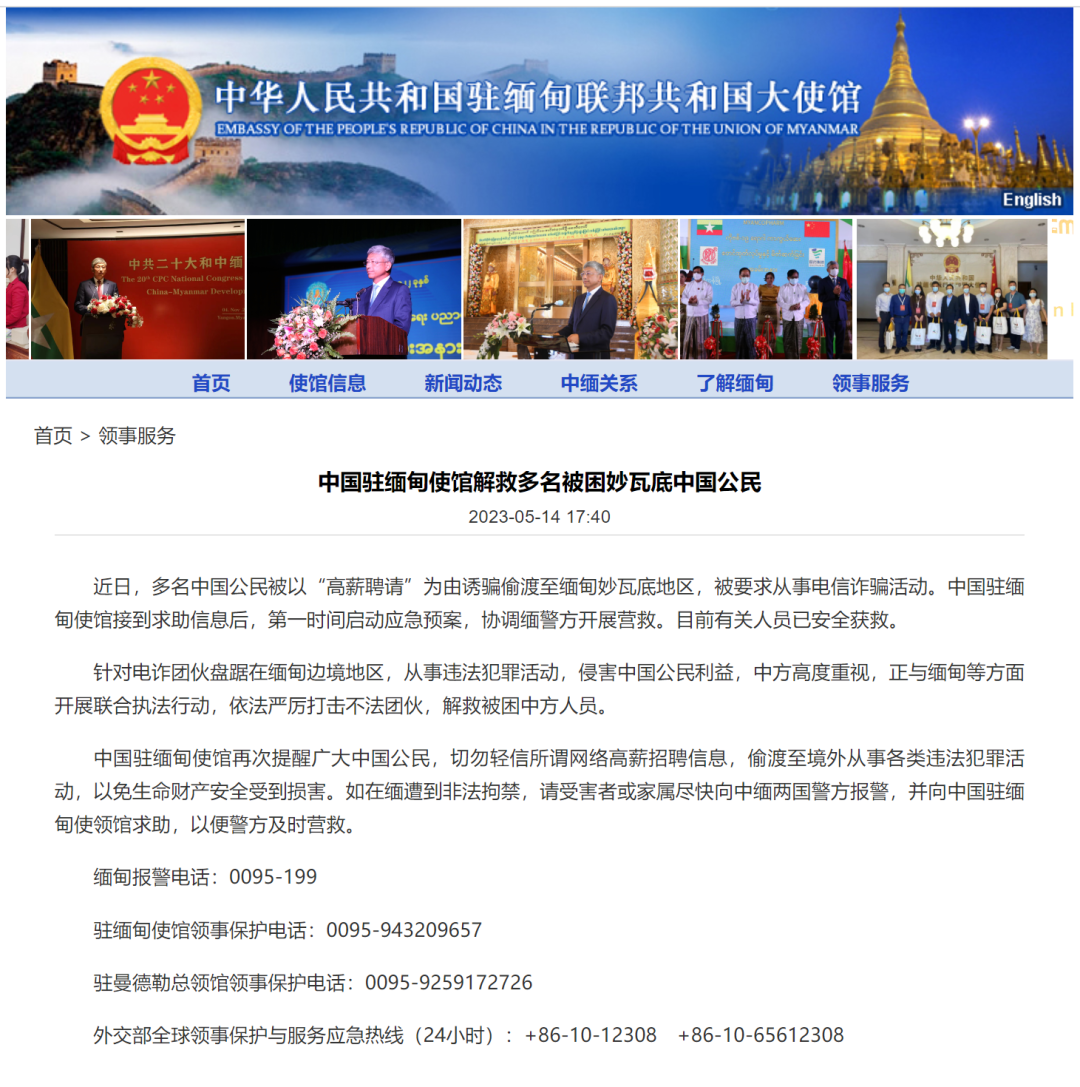 中國(guó)駐緬甸使館再次提醒廣大中國(guó)公民,切勿輕信所謂網(wǎng)絡(luò)高薪招聘信息,偷渡至境外從事各類違法犯罪活動(dòng),以免生命財(cái)產(chǎn)安全受到損害。如在緬遭到非法拘禁,請(qǐng)受害者或家屬盡快向中緬兩國(guó)警方報(bào)警,并向中國(guó)駐緬甸使領(lǐng)館求助,以便警方及時(shí)營(yíng)救。