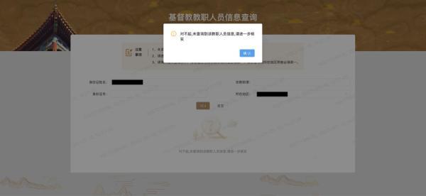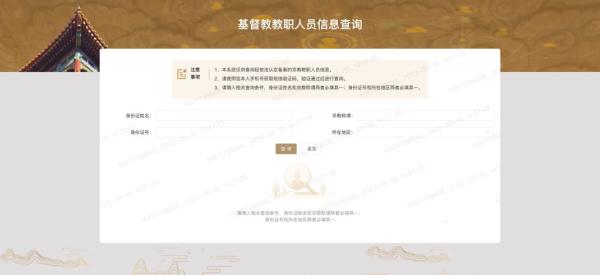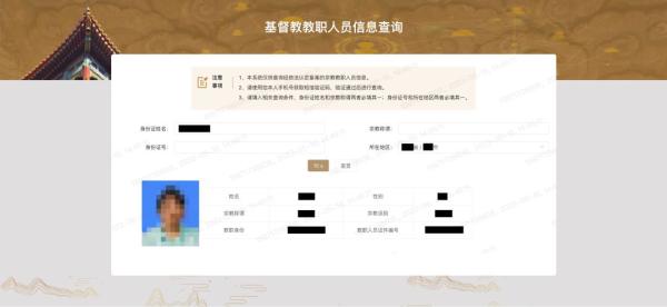 第三步:查詢系統(tǒng)將根據(jù)用戶輸入的查詢條件,在系統(tǒng)數(shù)據(jù)中進(jìn)行查詢。如果被查詢?nèi)舜_為經(jīng)依法認(rèn)定備案的宗教教職人員,系統(tǒng)將顯示該宗教教職人員相關(guān)信息。