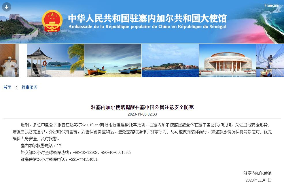 駐塞使館24小時領(lǐng)保電話:+221-774554051