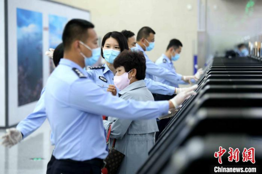 資料圖:山東出入境邊防檢查總站青島機(jī)場(chǎng)邊檢站民警為入境旅客快捷通關(guān)提供操作指引?!〗夂馈z
