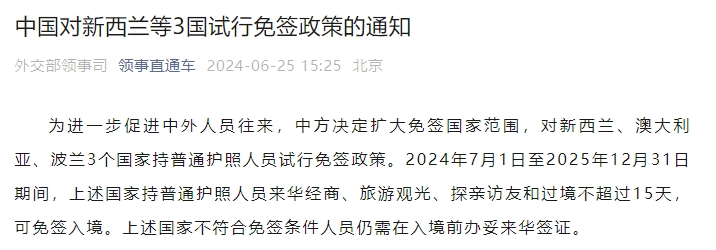 中國(guó)對(duì)新西蘭等3國(guó)試行免簽政策的通知