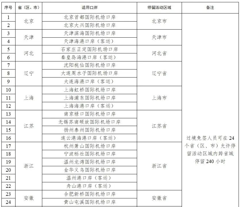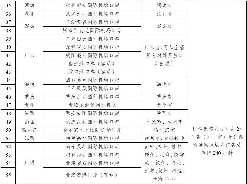 符合條件的俄羅斯、巴西、英國、美國、加拿大等54國人員,從中國過境前往第三國(地區(qū)),可從24個?。▍^(qū)、市)60個對外開放口岸中任一口岸免簽來華,并在規(guī)定區(qū)域停留活動不超過240小時。