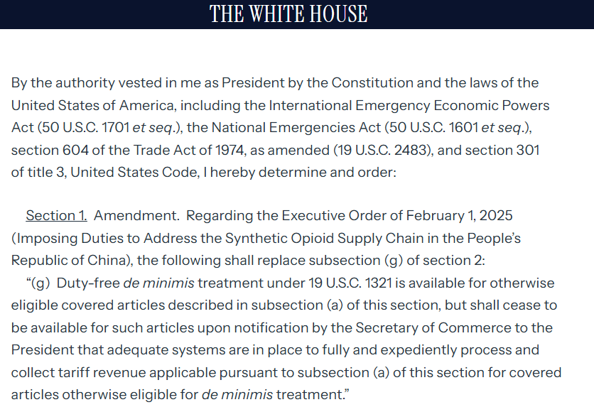 而根據(jù)白宮周五宣布的新行政令,目前對(duì)來自中國的商品將繼續(xù)實(shí)行“最低限度”關(guān)稅豁免待遇,直至商務(wù)部“建立足夠的系統(tǒng)來全面、迅速地處理和收取關(guān)稅收入”。