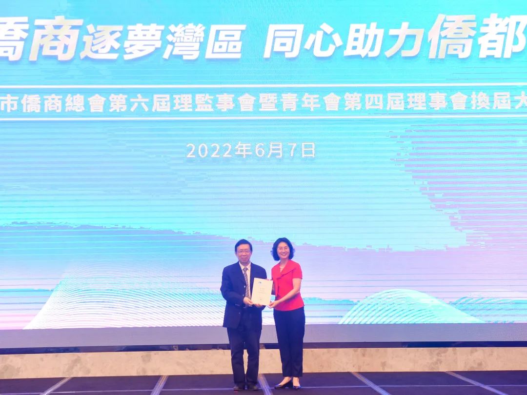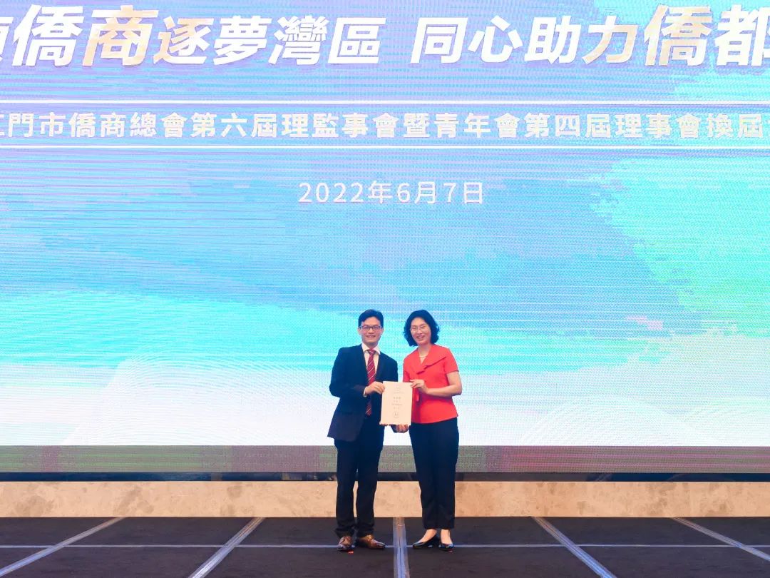 吳曉暉代表市委、市政府發(fā)表講話,她對大會的成功舉辦及新當選的理監(jiān)事會成員表示熱烈祝賀,對市僑商總會一直以來對江門經(jīng)濟社會發(fā)展所做的貢獻表示感謝。她表示,市僑商總會自2006年成立以來,穩(wěn)步前行,用實際行動為僑商之間、為僑資企業(yè)與政府之間的交流發(fā)揮了重要的橋梁紐帶作用,為家鄉(xiāng)發(fā)展、為粵港澳大灣區(qū)建設(shè)貢獻了力量。她寄語江門僑商,一要胸懷家國,增強機遇意識,堅定發(fā)展信心,圍繞市委、市政府“港澳融合”“僑都賦能”工程,調(diào)整產(chǎn)品結(jié)構(gòu)練好內(nèi)功,爭取更多市場份額,搶抓機遇展現(xiàn)新作為。要情系桑梓,在加快自身發(fā)展的同時發(fā)揮“鏈主”企業(yè)、骨干企業(yè)帶頭作用,聚焦工業(yè)、農(nóng)業(yè)、建筑業(yè)、文旅業(yè)等產(chǎn)業(yè)發(fā)展,堅持以商安商、以商聚商、以商促商,引領(lǐng)、帶動相關(guān)產(chǎn)業(yè)鏈協(xié)同發(fā)展,為扎實穩(wěn)住經(jīng)濟貢獻更大力量。要弘揚愛國愛鄉(xiāng)、拼搏進取的僑鄉(xiāng)精神,重視青年企業(yè)家的成長和企業(yè)家精神的傳承,積極參與長堤風(fēng)貌街等城市建設(shè),講好中國僑都故事,弘揚中國僑都文化。要積極踐行綠色發(fā)展理念,主動履行企業(yè)主體責(zé)任,積極參與山水林田湖草沙一體化保護和修復(fù)工作,發(fā)揮示范引領(lǐng)作用推動地區(qū)綠色經(jīng)濟和環(huán)境保護的協(xié)調(diào)發(fā)展。
