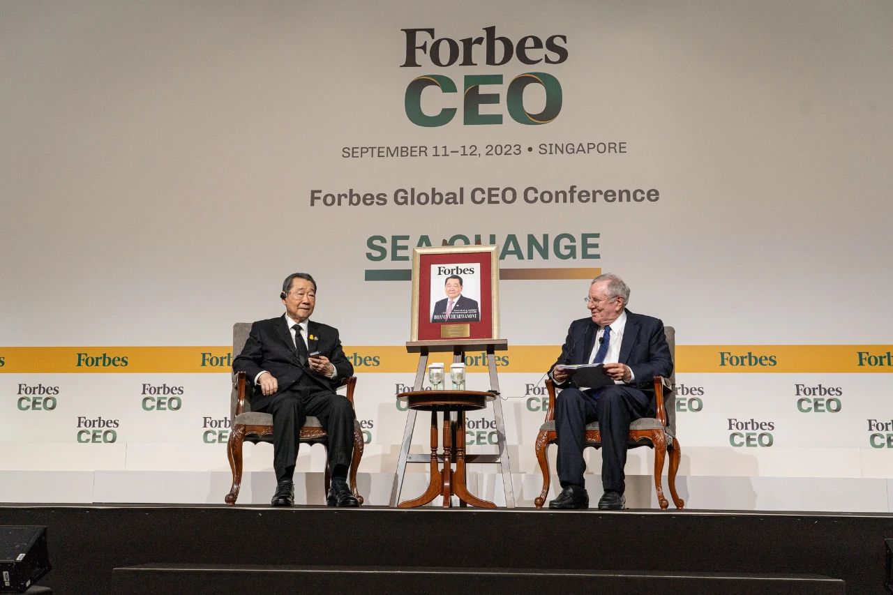 正大集團(tuán)資深董事長謝國民先生榮獲的福布斯終身成就獎,于9月11日當(dāng)天在新加坡舉辦的第21屆福布斯全球CEO大會上,由福布斯媒體集團(tuán)董事長兼主編史蒂夫·福布斯及副董事長克里斯托弗·福布斯親自頒發(fā)。在此次大會上,謝國民資深董事長和史蒂夫·福布斯先生還在臺上進(jìn)行了研討和交流。